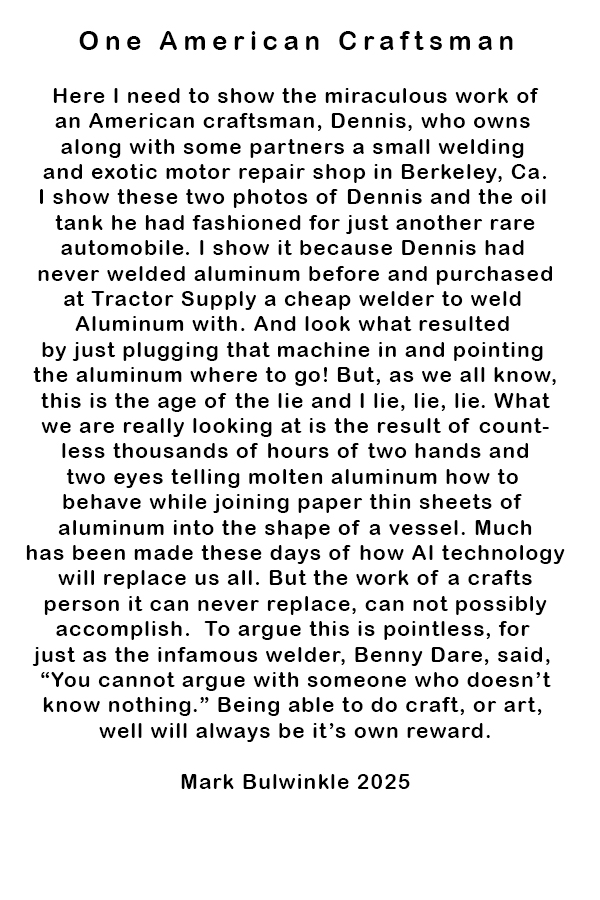 Dare To Be Dumb "First be sure you are wrong, and then go ahead." - mb Portrait photo by Sadie Hazelkorn in Joshua Tree, California. 2015 This site is a creation of the Artist, Mark Bulwinkle. It shows some of the work he considers "ornamental," or ornametal, created for clients for domestic use in and around their houses. The imagery used in these pieces is usually personal, having to do with the client, and always harvested from Mr. Bulwinkle's image library, a collection of varmints, critters, and people he has been inventing in his tiny brain for 56 years now. If you are curious what his work might cost, please e-mail Mark Bulwinkle at markbul@sonic.net for details. Mark Bulwinkle taking apart his largest piece of ornamental art, "The Thrillah on Manila" in Oakland, California's Rockridge in 1993. No, everyone, the City did not make him take it down. The picture is lifted from the Archives of the San Francisco Chronicle. The image that inspired 10,000 imitators. This piece sat atop that little bungalow in the Rockridge district of Oakland, California from 1980 to 1992 when I tore the entire steel infection down and returned the house to it's original boring bungalow in gray. Hey. She got the house and I got the trailer. And I have never stopped barking at the moon. The iconic piece of Oakland is now on a wall somewhere in Santa Fe, NM. Thanks for the memory.